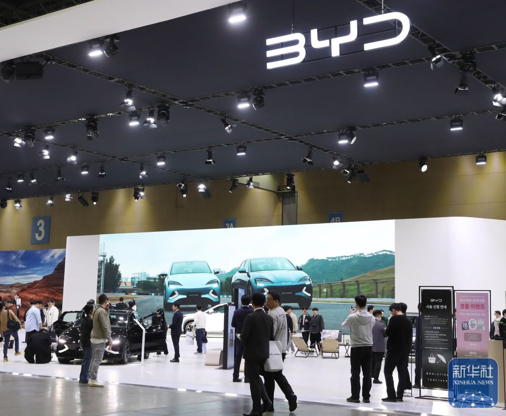 ↑2025年4月8日,在韩国高阳举行的 “2025首尔移动出行展”上,观众参观中国品牌比亚迪展区。