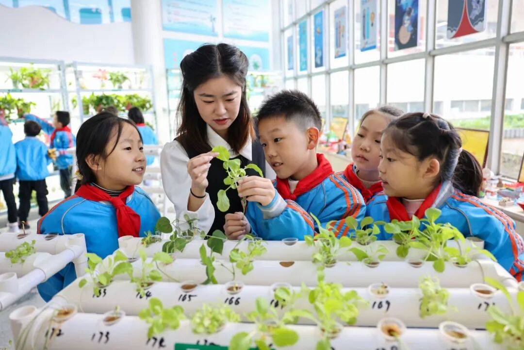 在湖北省襄阳市大庆路小学“校园农场”,教师在给学生讲解水培植物的相关知识。通讯员 聂志鹏 摄