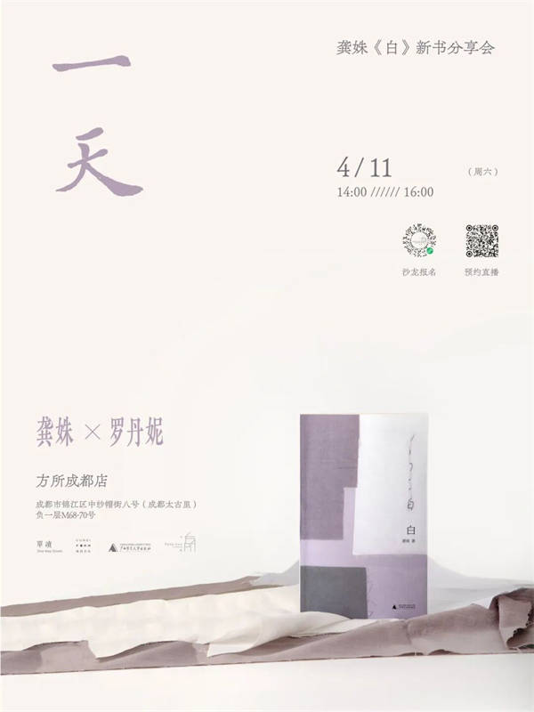 在诗集《白》出版以后,我们从诗歌中捕捉到了龚姝关于日常生活的思考,她在采访中提到“日常并不朴素,它很凶猛”。对于作为诗人的她而言,一天,不仅仅是时间上的刻度,也让她将目光投向生活的边角。4月11日,龚姝将在方所成都店举行第一场线下的新书分享会,与这本书的策划编辑罗丹妮一起讨论诗歌与创作,聊聊为什么开始写诗,如何找到自己真正的生命的工作,以及行动要如何从度过一天开始。