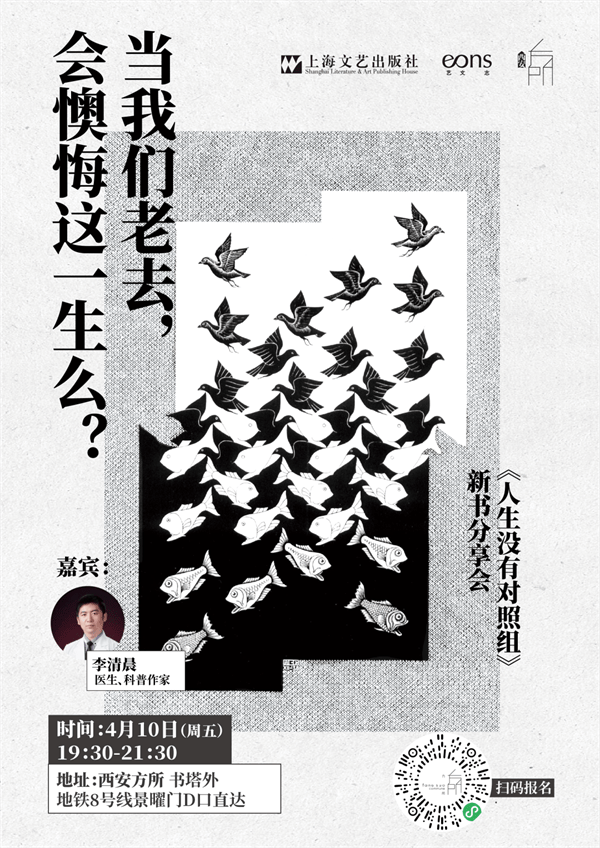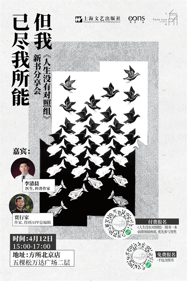 每天与疾病和人类的脆弱打交道,医生这个职业群体接触过比常人多得多的生命经验,他们对于生老病死、人生无常有更切近的体会。事实上,接触过的经验越多,医生就会越意识到,生命不能用确定的标准进行观测。当那些成功案例里写满了幸存者偏差,人生真的存在对照组吗?在新书《人生没有对照组》里,外科医生李清晨记录了自己四十岁之后对医学、人生与社会的观察,既分享自己或同行作为临床医生和循证医学实践者的生命经验,也讲述那些医院之外、科学从业者看到的真实发生的故事与背后的逻辑,为读者提供一份理性而坚实的思考陪伴。4月10日晚,西安方所特别邀请到李清晨,与我们分享他怎样看待每一个独特个体的成长、衰老,以及可能产生的懊悔。
