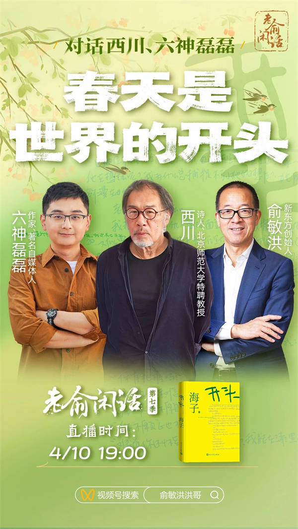 春天是世界的开头。在这万物复苏的时节,我们总能想起海子的诗句:“我只愿面朝大海,春暖花开。”小说集《开头》就是从海子的珍贵手稿中整理而出,均为首次面世。诗歌之外,海子的文字依然能给我们带来春天般的惊喜。4月10日晚,著名诗人、北京师范大学特聘教授西川和作家、著名自媒体人六神磊磊将做客“老俞闲话”直播间,一起聊聊海子与诗歌,聊聊诗歌之外的故事与文字。