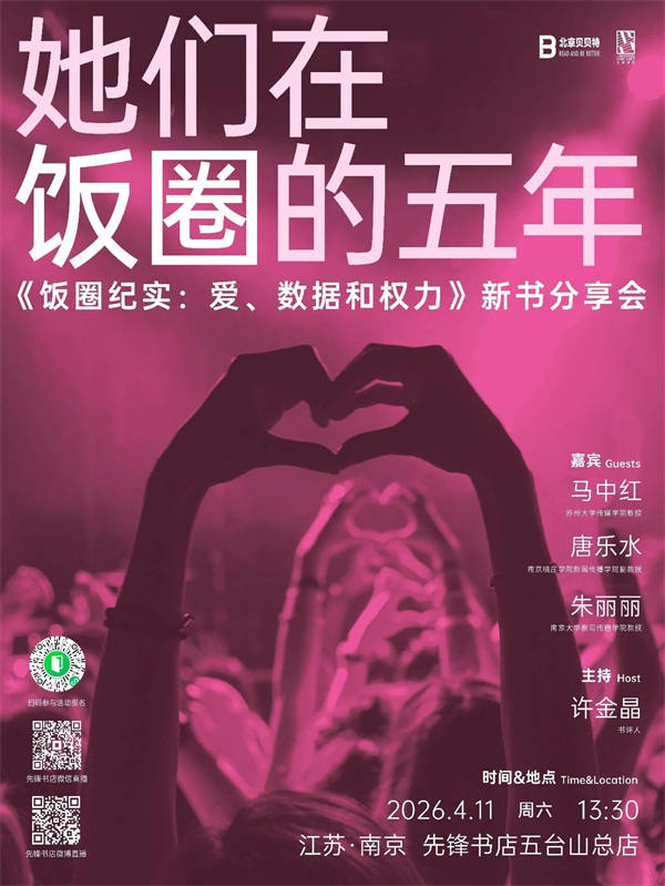 我们听过太多关于“饭圈”的传闻,却很少听见“圈内人”自己的声音。真实的饭圈世界是什么样子?马中红、唐乐水两位学者花五年时间真正走进饭圈,与饭圈中那些最普通粉丝朋友面对面聊天,将听到的故事写成《饭圈纪实:爱、数据和权力》。4月11日,苏州大学教授马中红、南京晓庄学院副教授唐乐水将来到先锋书店五台山总店,与南京大学新闻传播学院教授朱丽丽、书评人许金晶对话,将五年田野调查中最难忘的见闻娓娓道来,带读者走进这个比热搜更生动、比想象更复杂的世界。