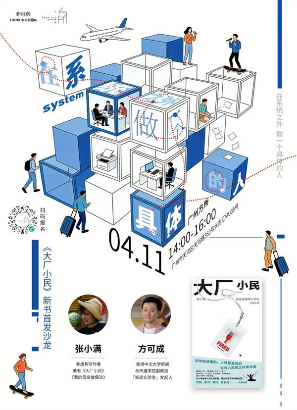 继《我的母亲做保洁》后,张小满带来非虚构新作《大厂小民》。她用第一人称的视角,记录下在互联网公司的1480天。在被算法与红点切割的日子里,来自一个小民的如实记述,告诉我们每一个具体的人依然拥有感知痛苦、拒绝异化的权利。4月11日,张小满将与香港中文大学副教授方可成做客广州方所。在这场终将出局的游戏里,让我们一起探讨:当做题家的经验失效,我们该如何找到自己的位置?在系统之外,又该如何做一个认真而具体的人。