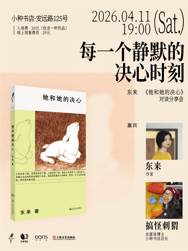 一次沉默的离开、一颗在流言中松动的心、一次向身体与精神靠拢的出拳……这些看似微小的时刻,构成了真正的“决心”,从无可奈何的瞬间生出微光般的转折。东来全新小说集《她和她的决心》,六篇小说从不同角度切入女性生活,从第一个故事里的浮沉与挣扎,到最后一个故事里的自在与自为,其间是放弃和放弃的决心。本周六,东来将出现在安远路的小种书店,与大家分享她的决心!