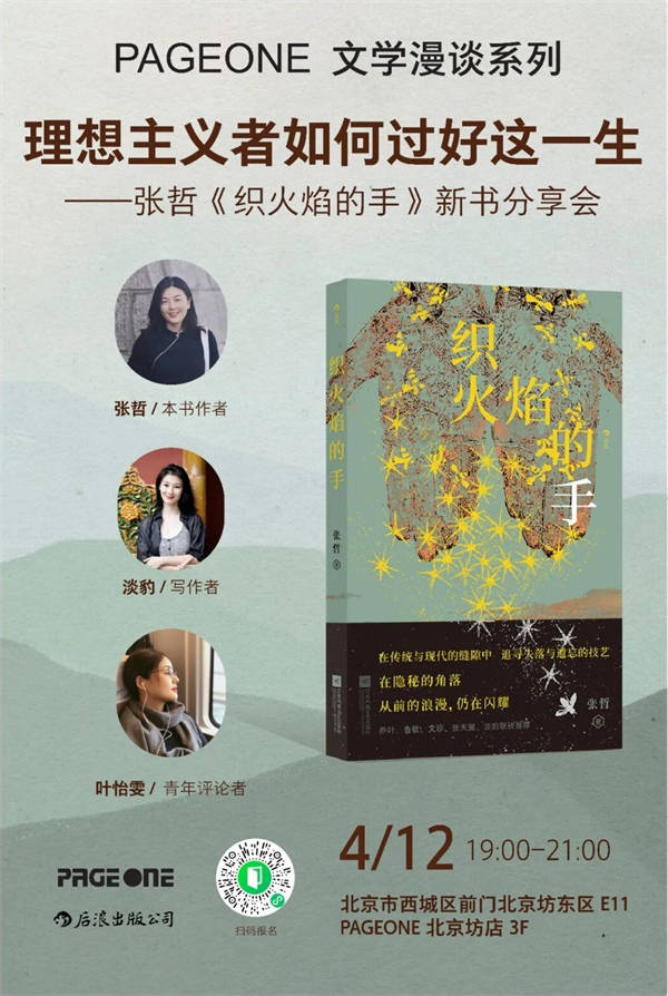 火绘匠人、相声艺人、江湖厨师、养蜂人、乡村医生、种植农户、挖煤工……这些职业,对于生活在城市里的人群而言,都相对陌生。但在《织火焰的手》这批作品之中,张哲以严肃的观察与扎实的田野工作,对这群依然抱有“理想”之人的生活与人生进行重构。4月12日,张哲将和写作者淡豹、青年评论者叶怡雯一起,在PAGEONE北京坊店3楼的落地窗前,为大家带来这本《织火焰的手》的新书分享会,一起探索这个永恒的课题——理想主义者如何过好这一生?