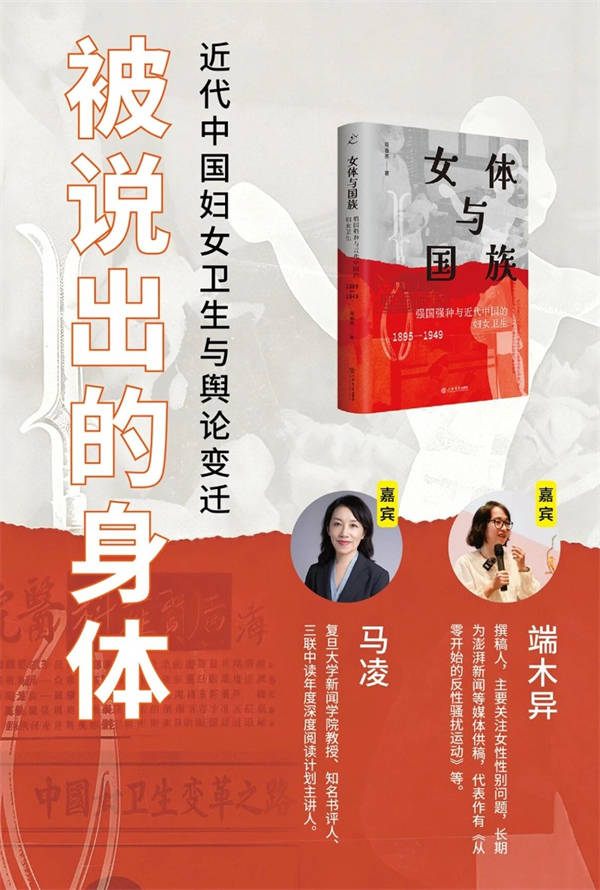 《女体与国族:强国强种与近代中国的妇女卫生(1895-1949)》以1895-1949年为时间轴,系统梳理近代中国妇女卫生观念与实践的演变。本书通过报刊、医学文献及多种历史材料,重建从禁止缠足、月经知识的传播、卫生用品的变迁,到公医助产制度建立、“国民母”观念形成的历史过程,呈现女性身体如何在公共卫生与社会舆论的交织中,被不断塑造与重构。4月11日下午,学习读书会特别邀请到复旦大学新闻学院教授马凌以及自由媒体撰稿人端木异,一起回望女性身体如何被“说出”的历史,以及这段历史如何仍在影响我们的当下。