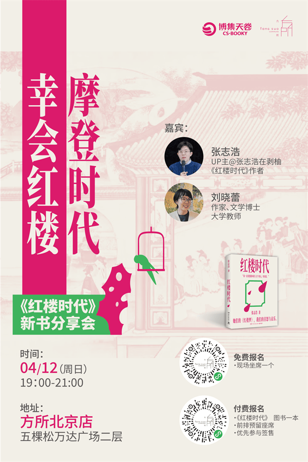 4月12日,《红楼时代》作者张志浩与作家刘晓蕾将一同做客方所北京,与大家一起聊聊每个人心中的红楼梦,感受那些超越时代的命运回响。
