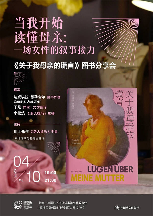 我们是在哪一个瞬间,开始真正读懂母亲的?德国图书奖决选作品《关于我母亲的谎言》,正是从这样一个追问开始的。作者达妮埃拉·德勒舍尔以半自传的笔触,讲述了一个女儿试图理解母亲一生的故事。这是一场跨越时间的母女对话,更是一场女性的叙事接力。4月10日晚,我们非常荣幸地邀请到了达妮埃拉·德勒舍尔,她将与作家、文学翻译于是,以及播客“路人抓马”主播小松悠和川上先生,共同围绕“当我开始读懂母亲”展开对谈。