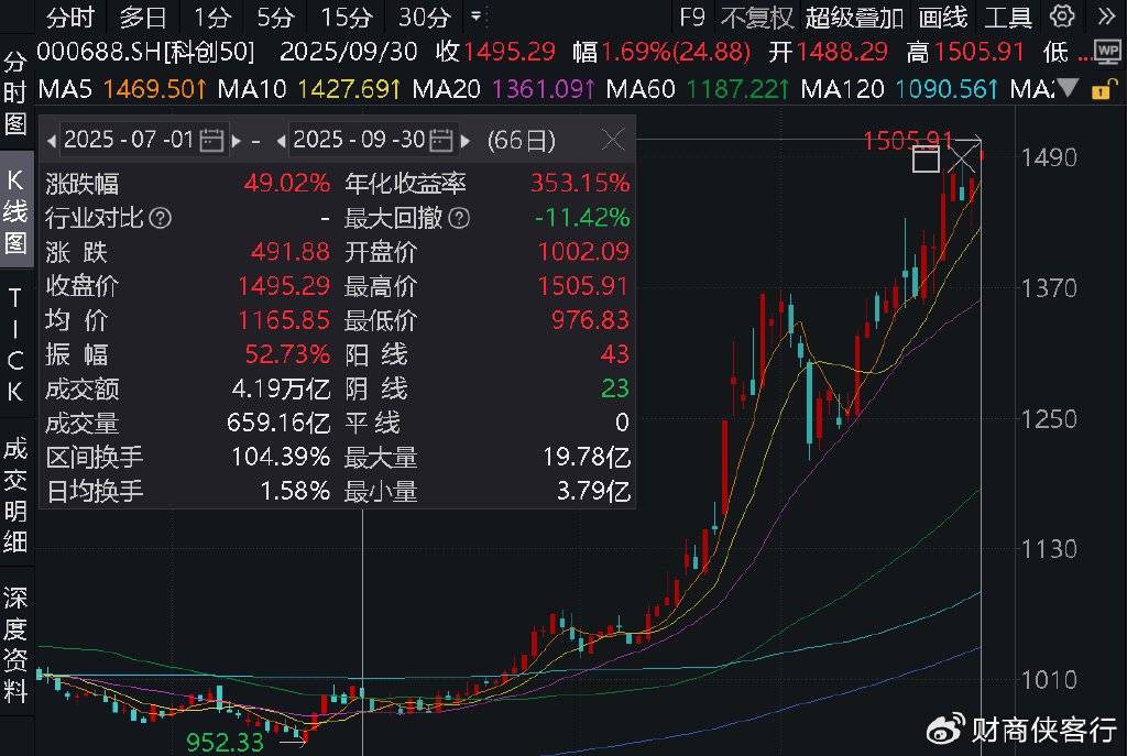 科创50指数三季度上涨了49%,和创业板指相同,也是几乎贡献了前三季度全部涨幅。