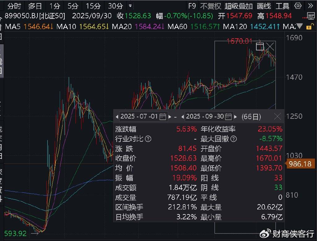 不过,北证50指数自924行情启动以来的不足600点,到9月30日收盘的1528点,区间累计涨幅已经超过1.5倍,涨幅领先同期科创50的132%和创业板指的111%。