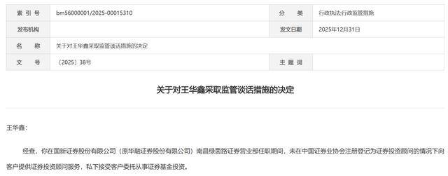根据《证券投资顾问业务暂行规定》第三十三条、《证券经纪人管理暂行规定》第二十四条第一款以及《证券基金经营机构董事、监事、高级管理人员及从业人员监督管理办法》第五十一条第一款的相关规定,江西证监局决定对王华鑫采取监管谈话的行政监管措施,并记入证券期货市场诚信档案。王华鑫应携带有效身份证件于2026年1月6日10时到江西证监局接受监管谈话。