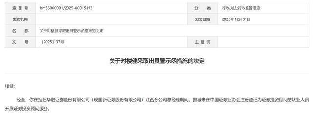 另一则行政监管措施公告显示,楼健在担任国新证券江西分公司总经理期间,推荐未在中国证券业协会注册登记为证券投资顾问的从业人员开展证券投资顾问服务。