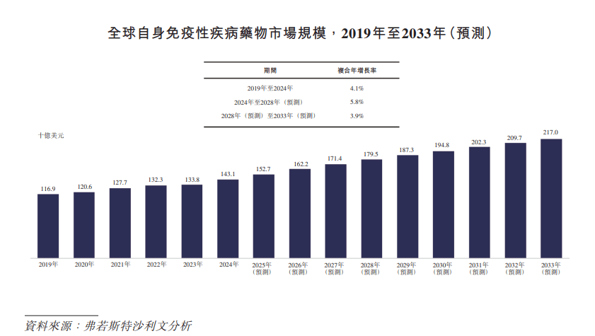 自身免疫疾病是指机体的免疫系统因遗传、环境或其他因素的异常,错误地识别并攻击自身组织或细胞,导致组织损伤、功能障碍或器官衰竭的一类疾病,已成为除心血管疾病和癌症外第三大慢性病。从2019年到2024年,全球自身免疫性疾病药物市场规模从1169亿美元增长至1431亿美元,复合年增长率为4.1%。预计到2028年和2033年,全球自身免疫性疾病药物市场规模将分别达到1795亿美元和2170亿美元,2024年至2028年的复合年增长率为5.8%,2028年至2033年的复合年增长率为3.9%。