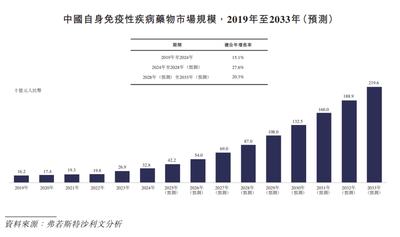 在各种自身免疫性疾病患病率不断上升、大量临床需求未得到满足及研发取得重大进展等因素的推动下,中国自身免疫性疾病药物市场近年来呈现快速增长态势。从2019年到2024年,中国自身免疫性疾病药物市场规模从162亿元人民币增长至328亿元人民币,复合年增长率为15.1%。预计到2028年和2033年,中国自身免疫疾病药物市场规模将分别达到870亿元人民币和2196亿元人民币,2024年至2028年的复合年增长率为27.6%,2028年至2033年的复合年增长率为20.3%。