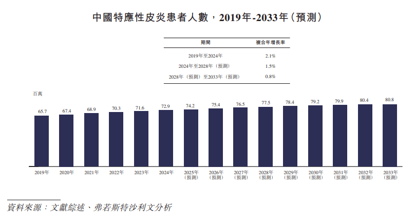 特应性皮炎(AD)是一种慢性、复发性、炎症性皮肤病,临床表现为瘙痒,多形性皮损并有渗出倾向。中国特应性皮炎患者人数于2024年增加至7290万人,2019到2024年的复合年增长率为2.1%。预计2028年,中国特应性皮炎患者人数将达到7750万人,2024到2028年复合年增长率预计达到1.5%。到2033年,中国特应性皮炎患者人数将达到8080万人,2028年到2033年复合年增长率预计为0.8%。