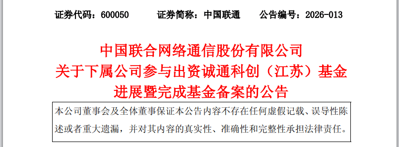 2026-02-17华体会,华体会体育官网,华体会体育,华体会体育APP下载2月13日,中国联通发布公告宣布,其间接控股子公司——联通创新创业投资有限公司(简称“联通创投”)以自有资金出资10亿元人民币参与认购的诚通科创投资基金(江苏)有限公司(简称“诚通科创(江苏)基金”)已在中国证券投资基金业协会完成备案。