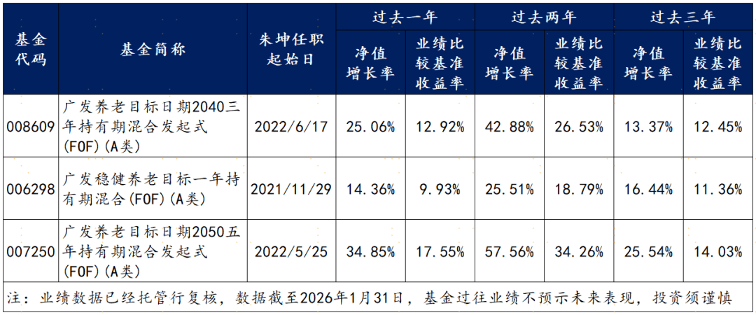 数据显示,截至2026年1月31日,朱坤共在管3只FOF产品,过去一年回报均跑赢业绩比较基准,平均超额收益达10%。其中,广发养老目标日期2040三年持有由其独立管理,近一年上涨25.06%,超额收益超12个百分点,在同类基金中排名前40%(7/20)分位;广发稳健养老目标一年持有、广发养老目标日期2050五年持有近一年回报分别为14.36%、34.85%,分别超越业绩基准超4个百分点、17个百分点,同类排名分别为前10%(7/83)分位、前30%(5/15)分位。