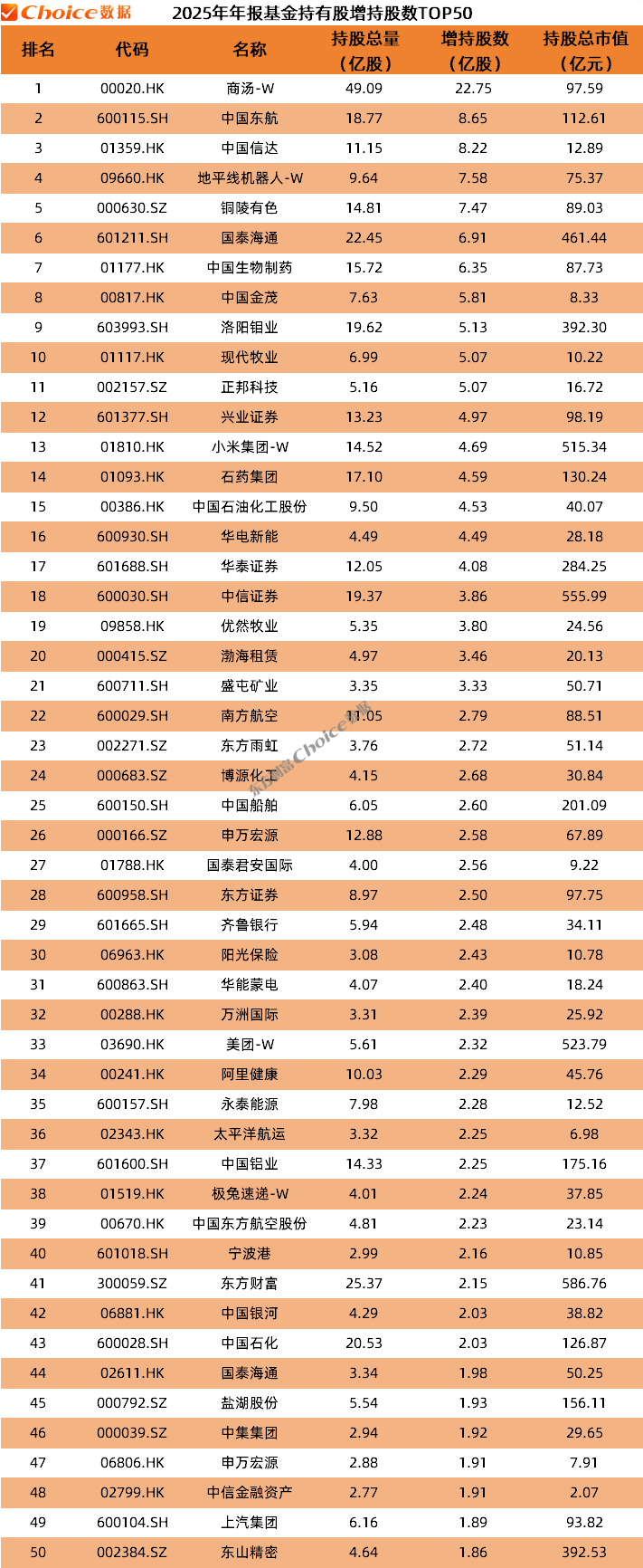 在基金增持股数TOP50的榜单中,商汤-W位列第一,2025年末基金持股数量从中报的26.34亿股增加至49.09亿股,增持了22.75亿股,总市值达97.59亿元。