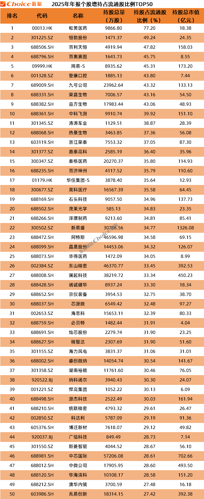 截至2025年末,基金持股占个股流通比例最大的是和黄医药,98只基金累计持有9866.8万股,占流通股77.20%,总市值达到18.38亿元。