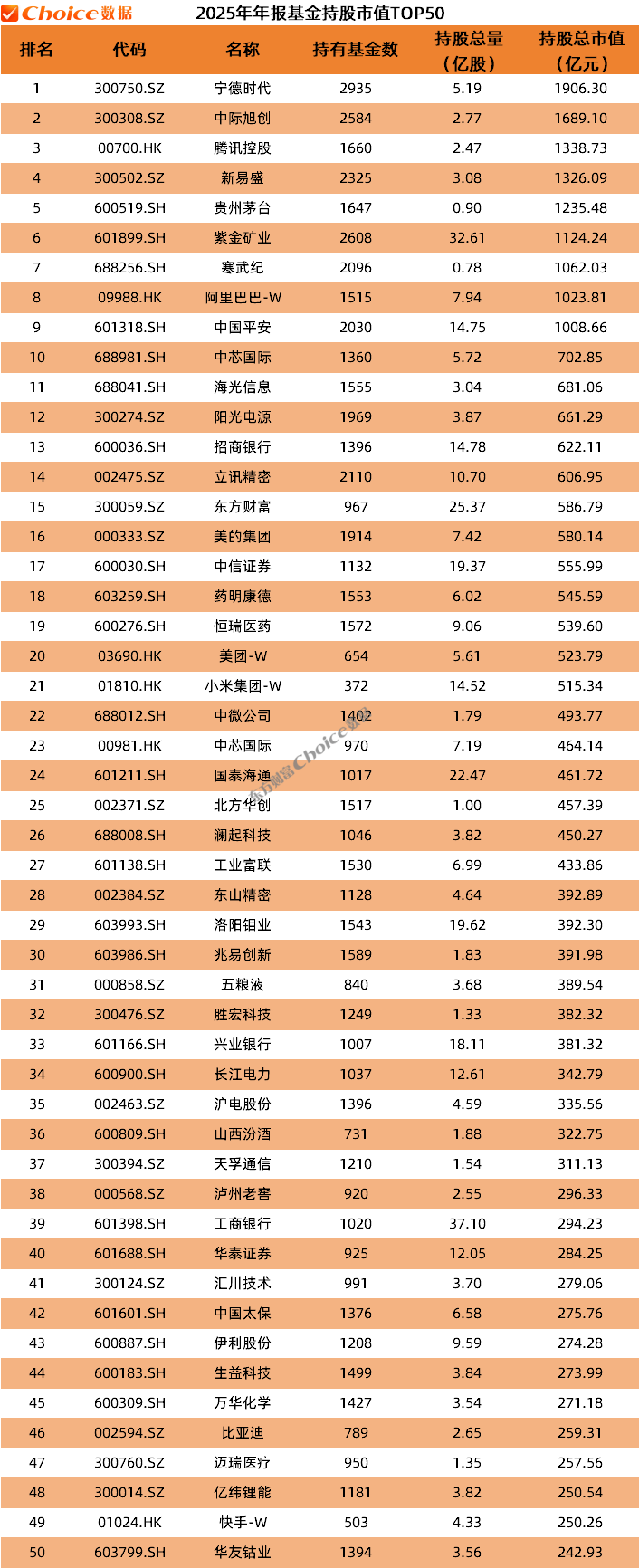 在基金年报持股总市值TOP50中,宁德时代为公募基金第一大持仓股,共2935只基金持有,持股总市值1906.3亿元。其次,中际旭创、腾讯控股、新易盛、贵州茅台分别以持股总市值1689.1亿元、1338.73亿元、1326.09亿元、1235.48亿元位列第二至第五位。