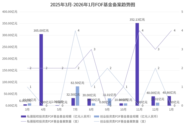 FOF基金阶段性备案:仅1月备案4支私募股权投资类FOF,规模40.86亿元,创业投资类FOF零备案,FOF仍以成熟赛道稳健配置为主。