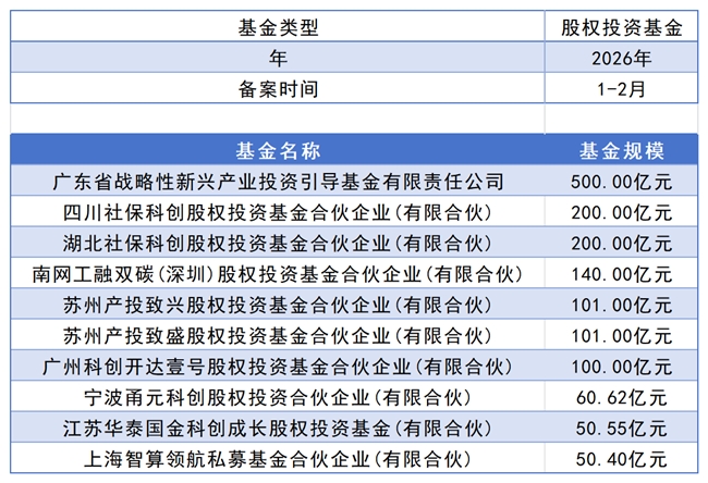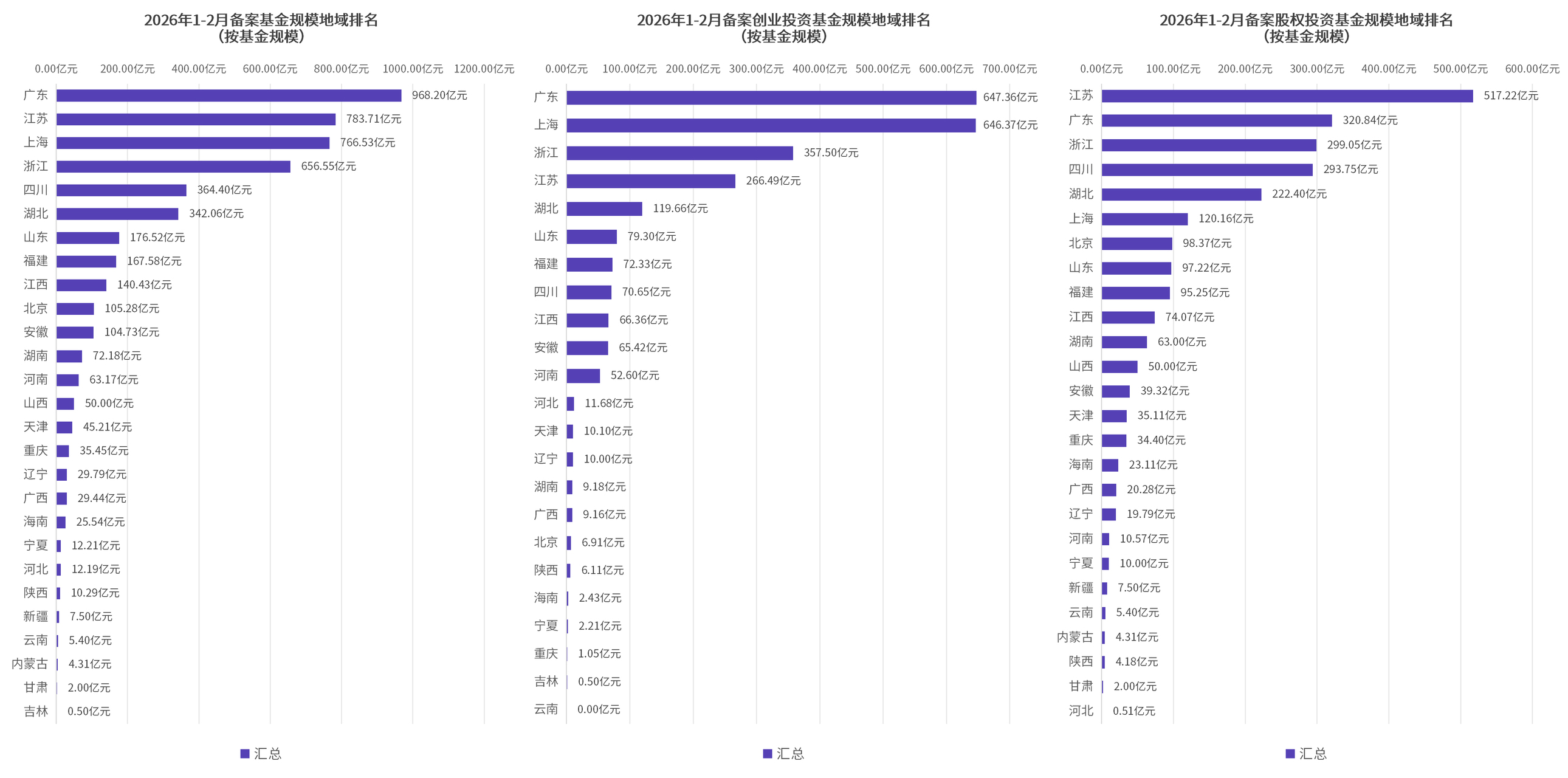 股权投资基金规模在2025年末冲高后,2026年1-2月整体高位回调,头部省份表现分化,部分区域2月延续增长。