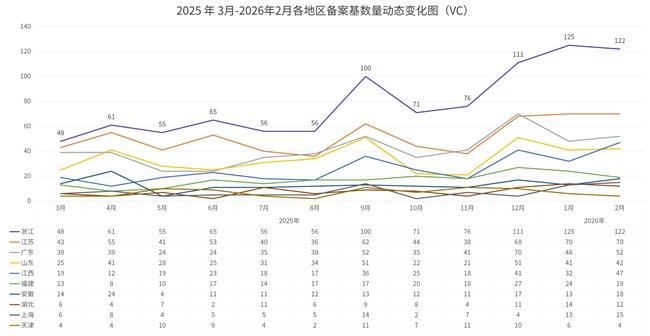 数量端浙江绝对领跑,鲁赣快速崛起:备案总量上,浙江(286支)、江苏(184支)、广东(122支)、山东(102支)、江西(94支)稳居前五,浙江VC备案247支,占本省总量超86%。梯队特征上,浙江1-2月均超130支持续领跑;江苏稳定80支以上;广东、山东维持高位;江西2月VC数量大幅增至47支,回升态势强劲。