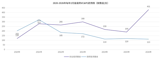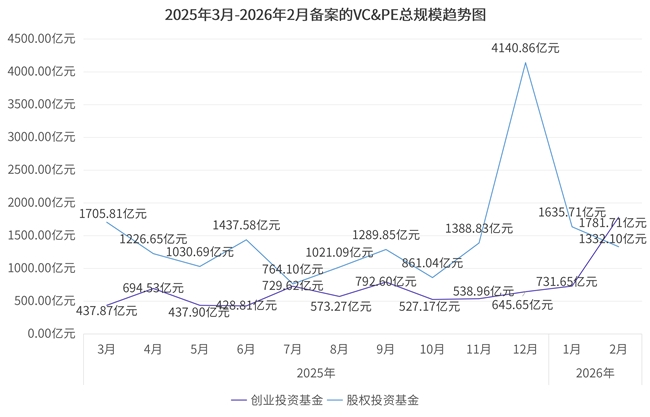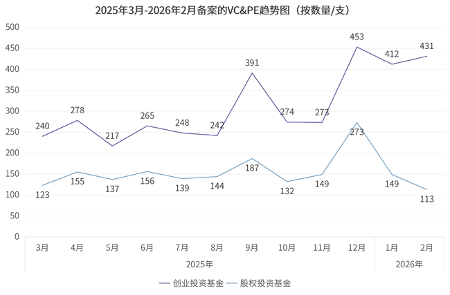 结构呈现VC强、PE弱:新备案创业投资基金843支(占比76.3%)、规模2513.36亿元,股权投资基金262支、规模2967.81亿元;VC数量占比绝对领先,PE单基规模更大但2月数量同比小幅下滑。