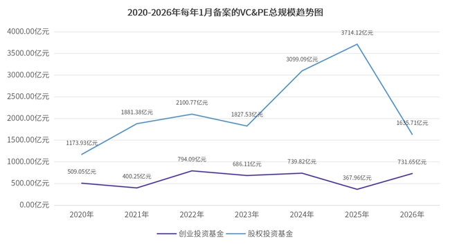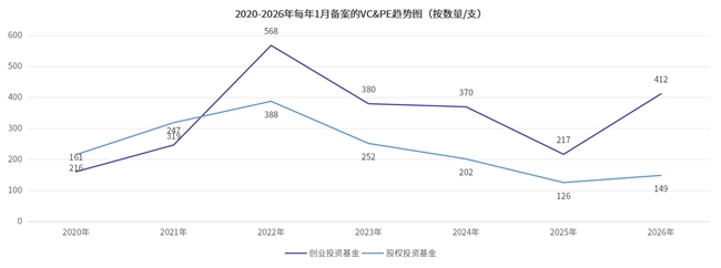 总的来看,股权投资基金备案数量整体低于创业投资基金,2026年1-2月虽较12月峰值有所回落,但仍维持在历史较高水平,整体呈现高位回调态势。