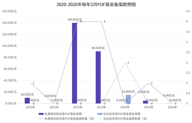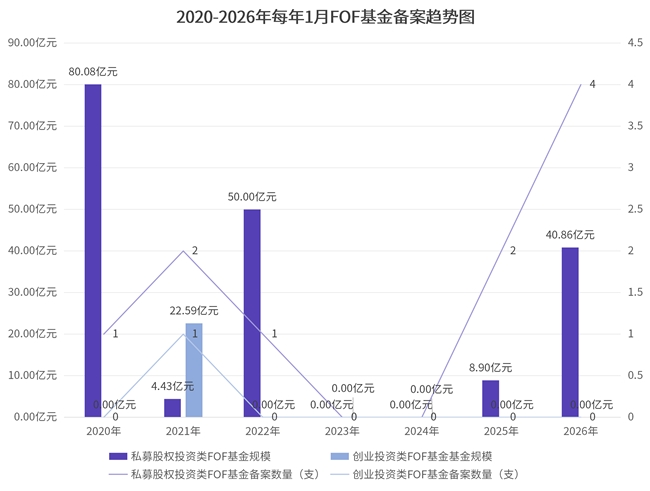 2026年1月新备案FOF基金4支,皆为私募股权投资类FOF基金,基金规模约40.86亿元,2026年2月备案0支FOF基金。