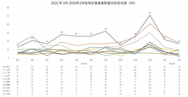 月度动态头部稳、尾部分化:浙江、江苏、广东持续高位运行;上海VC2月回升至15支,北京、天津整体低位波动;四川、湖北PE规模阶段性冲高后回落。