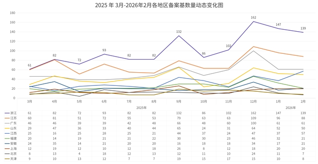 总的来看,2026年1-2月各地区备案基金数量整体维持高位运行,其中1月延续2025年12月的峰值态势,2月虽有回落但仍处历史高位。